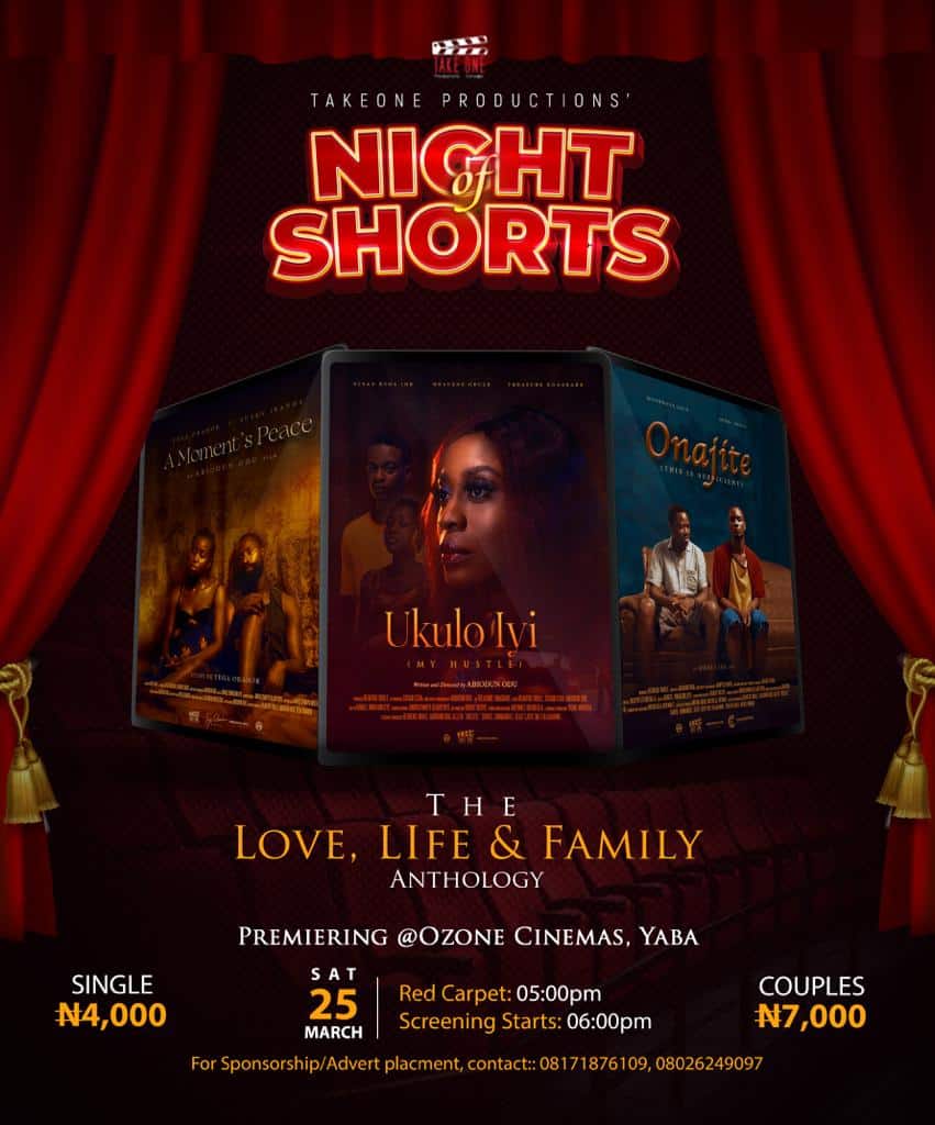 Take One Productions, a full-service media production company, is pleased to announce “Night of Shorts,” a film screening event featuring the works of up and coming filmmakers, on March 25th, 2023 at Ozone cinemas Yaba.